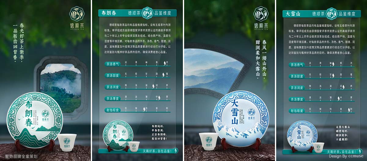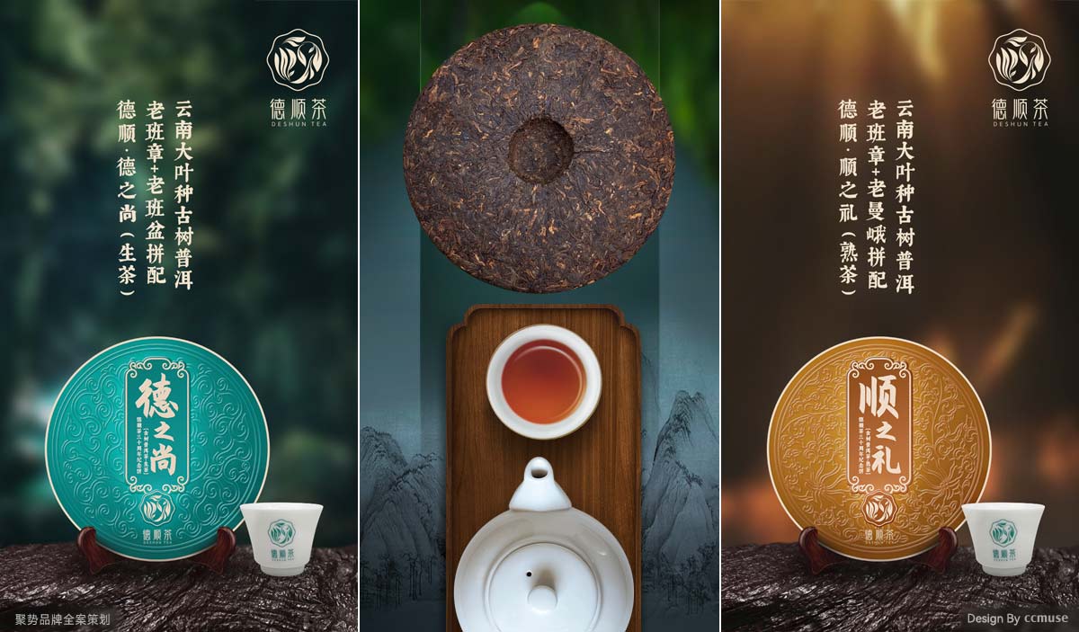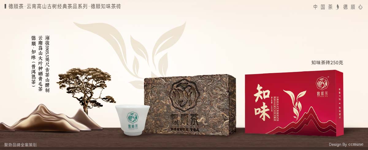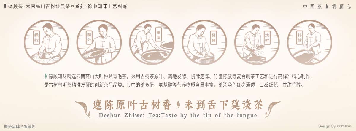 我们为德顺知味系列提炼的广告语是:“高山古茶,知心知味”,辅助说明文案:“速陈原叶古树香,未到舌下莫谈茶”。