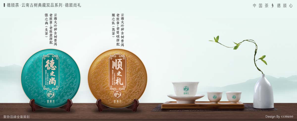 德顺茶【德顺尚礼】系列茶饼是品牌感极强的理念+创意设计,传递人文情怀,整体视觉构成均衡,充分传达茶品特色。茶不仅是健康饮品,更是有社交功能的礼仪载体。