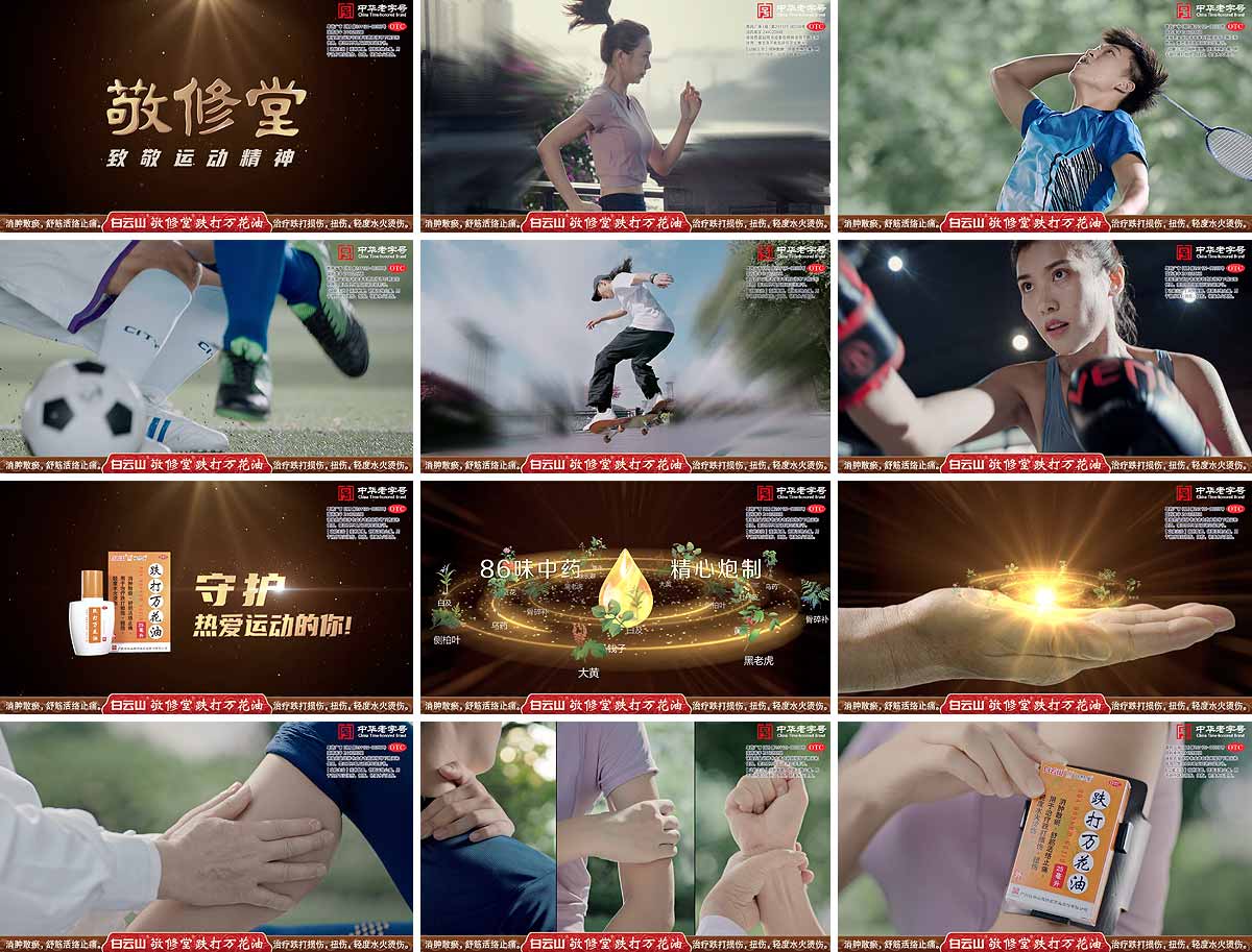 TVC影视广告创意以“敬修堂,致敬运动精神”开篇,以“跌打万花油,守护热爱运动的你”回扣主题,从品牌态度、目标群体,到产品功效,形成了品牌营销逻辑的完整闭环。
