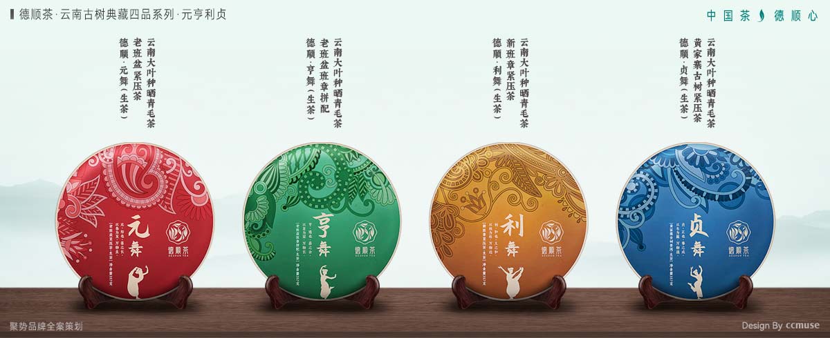 这套德顺茶357克高端茶礼系列的底色分别是四季的主色调,整体构成元素颇具云南风情,花纹是云南特色的各种高山植物,包括大叶种古树茶、花朵、卷曲的蕨类植物等,对应元舞、亨舞、利舞、贞舞的四个舞蹈女子,头顶云南少数民族特色的粗布包头帽、插着两片茶叶的造型,也是原创设计风格。