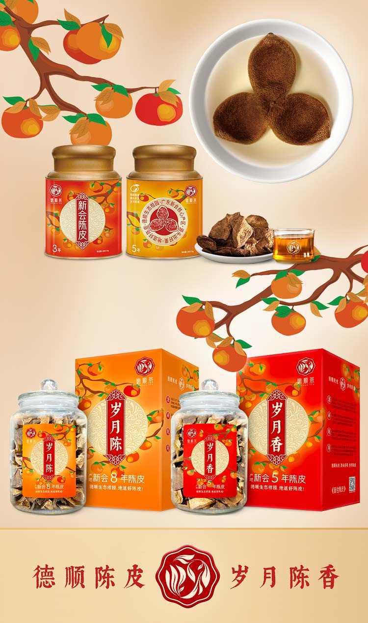德顺陈皮出自新会核心产区的生态柑园种植基地。聚势助推德顺陈皮品类升级,以更清晰的ICON、更舒展的线条、更治愈的色调,给你触手可及的温暖,德顺品牌礼盒,带来时光沉淀的仪式感。
